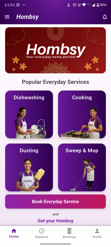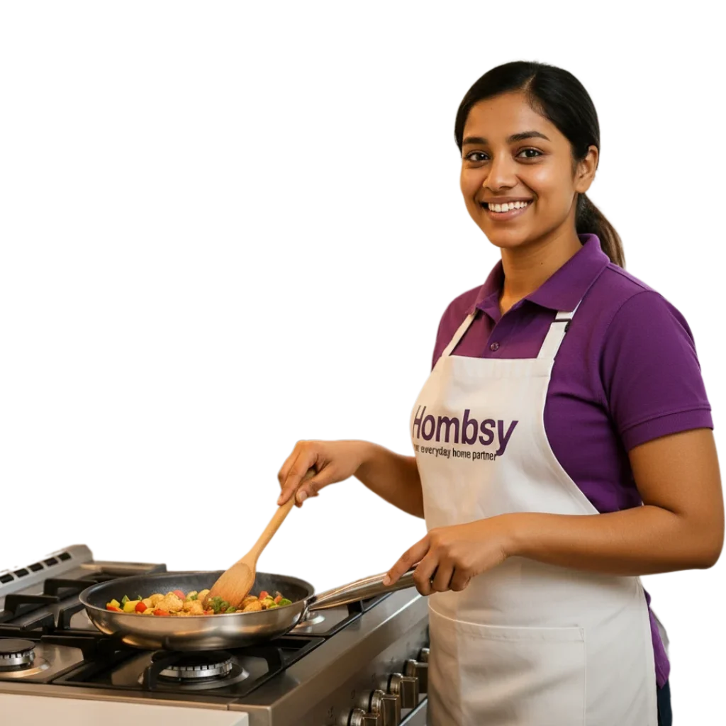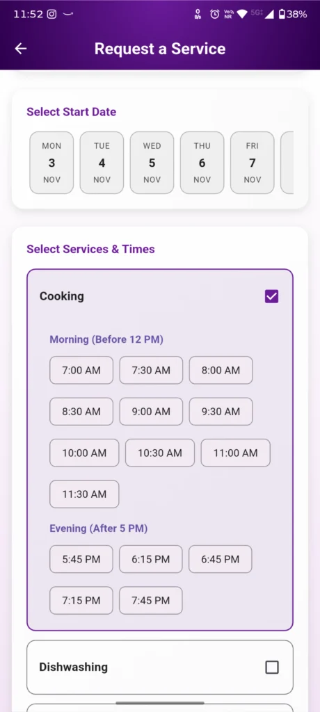 Choose the type of household help you need, like cooking, dusting, or dishwashing.